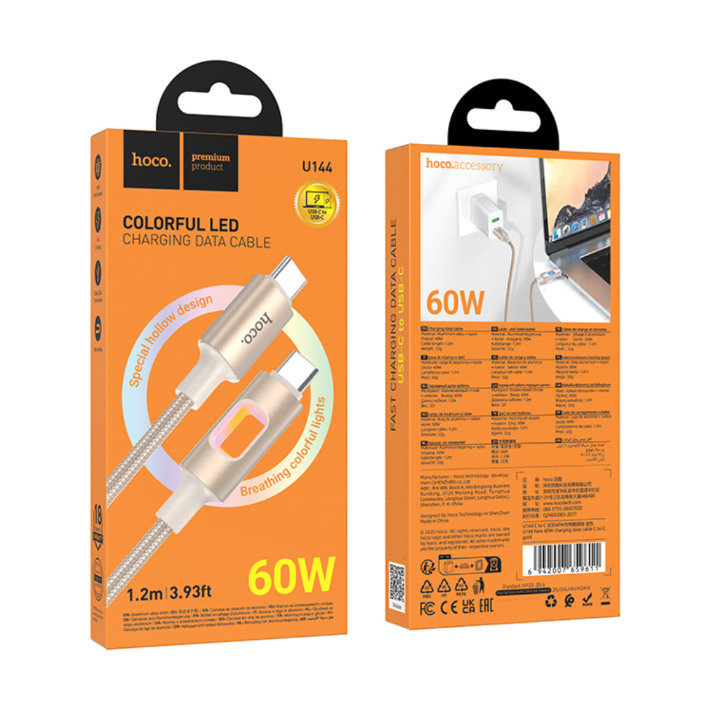 Καλώδιο Hoco U144 USB-C σε USB-C 60W Fast Charging 3A με Φωτισμό Braided Χρυσό 1.2m